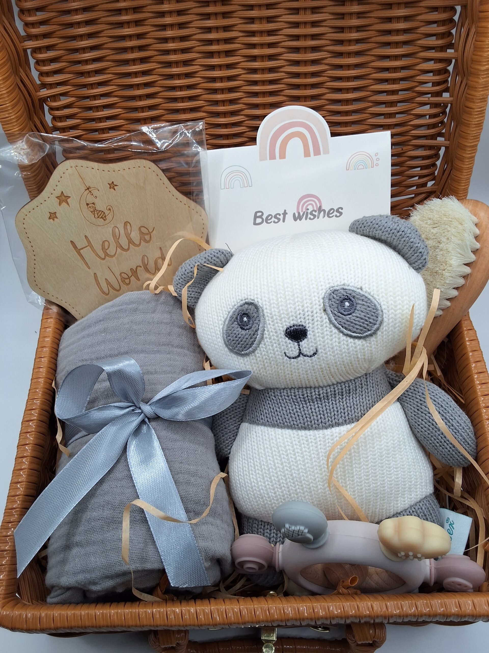 Each hamper comes with a cuddly knitted toy in one of three designs: Panda, Bear, or Rabbit. The toy is soft, lightweight, and perfect for newborn photography. The breathable muslin swaddle is also included, and it is ideal for wrapping, nursing, or using as a light blanket. It stays gentle on the skin and becomes softer after every wash. As a result, it offers comfort throughout the day.A “Hello World” wooden card is included for beautiful first-day photos. Everything is arranged in a reusable wicker basket, making the hamper ready to gift for baby showers, hospital visits, or welcome-home celebrations. Moreover, the basket can be reused for storage, which makes the set practical for parents.